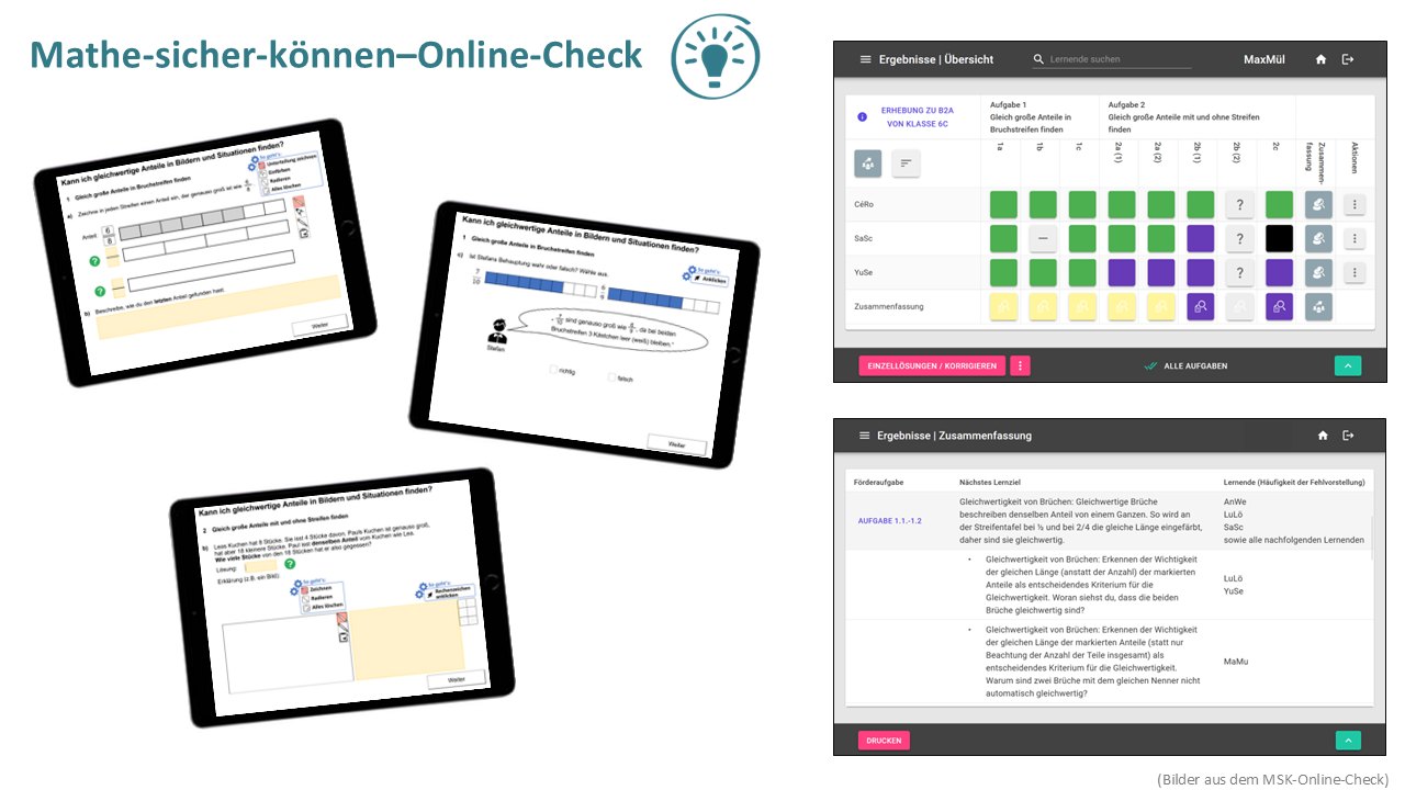Darüber hinaus können die Standortbestimmungen (Vor- und Nach-Checks) im Mathe-sicher-können-Online-Check von den Lernenden am Tablet oder PC ausgefüllt werden. Die digitale Diagnoseplattform wertet geschlossene Items automatisch aus, bei offenen Items erhalten die Lehrkräfte Vorschläge für Auswertungskategorien. Die Ergebnisse der Auswertungen werden Lehrkräften in fünf Dashboards angezeigt, die handlungsleitende Hinweise für die anschließende Förderung geben. Weitere Informationen zum MSK-Online-Check finden Sie unter dem Reiter "Online-Check".