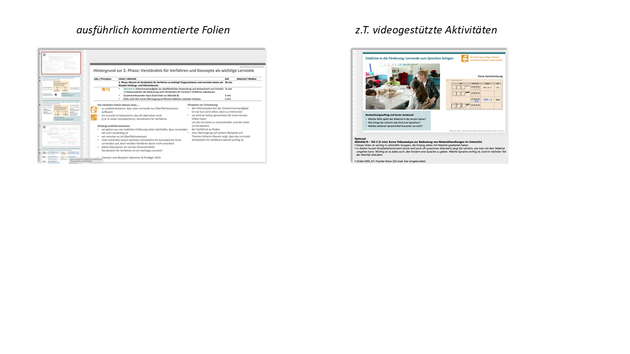 Die Fortbildungsmaterialien umfassen kommentierte Folien, Steckbriefe, Videoclips aus dem Unterricht zur Analyse und Aktivitäten für Lehrkräfte. Sie sind als Materialpakete für Multiplizierende (d.h. Fachberatungen, Fortbildende, Fachnetzwerkleitende, Moderierende etc.) frei als Open Education Ressources verfügbar (nach einmaliger Registrierung und Bestätigung der Nutzungsbedingungen, z.B. für datengeschützte Videoszenen, auf der Seite des DZLM).