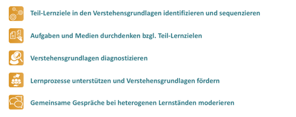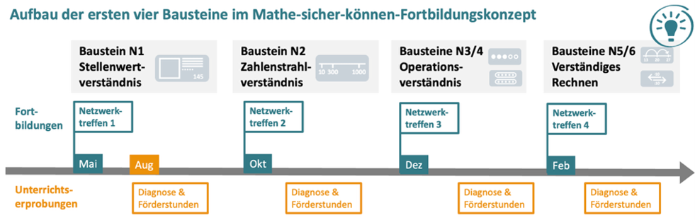Viele Lehrkräfte äußern den Bedarf, sich in die Verstehensgrundlagen, wie z.B. das Stellenwertverständnis, gründlich einzudenken. Dazu dient eine langfristig angelegte Fortbildungsreihe. Das Mathe-sicher-können-Fortbildungskonzept besteht aus vier Fortbildungsbausteinen für Jahrgang 4 bzw. acht Fortbildungsbausteinen für Jahrgang 5/6.